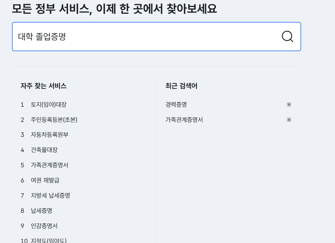- 정부24 활용: 검색창에 '고등학교 졸업증명'만 쳐도 바로 나옵니다.