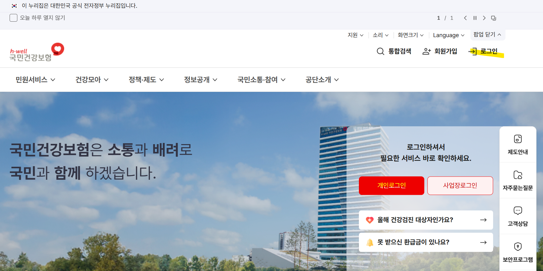 - 포털에서 **'국민건강보험공단'**을 검색하여 공식 홈페이지로 접속합니다.