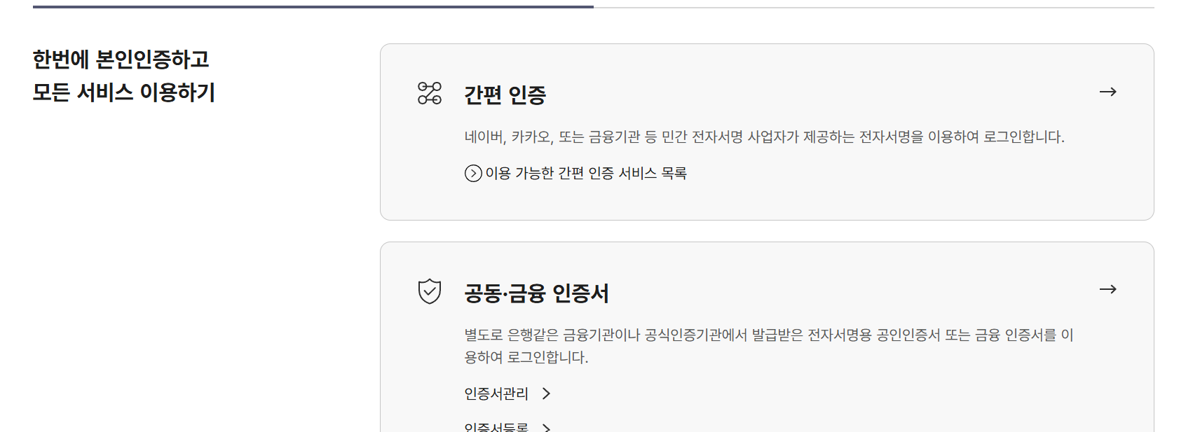 - 공동 인증서 또는 간편 인증을 통해 본인 인증을 완료하고 로그인합니다.