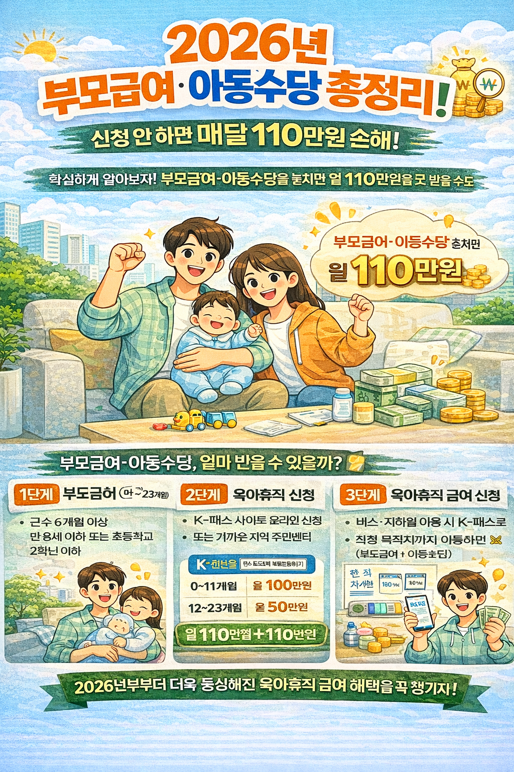 0세 아이를 키우는 집이라면 부모급여 110만 원과 아동수당 10만 원을 더해 매달 총 120만 원을 받을 수 있는 셈이죠. 이 루틴이 여러분의 행복한 육아 생활에 든든한 경제적 뒷받침이 되길 바랍니다!