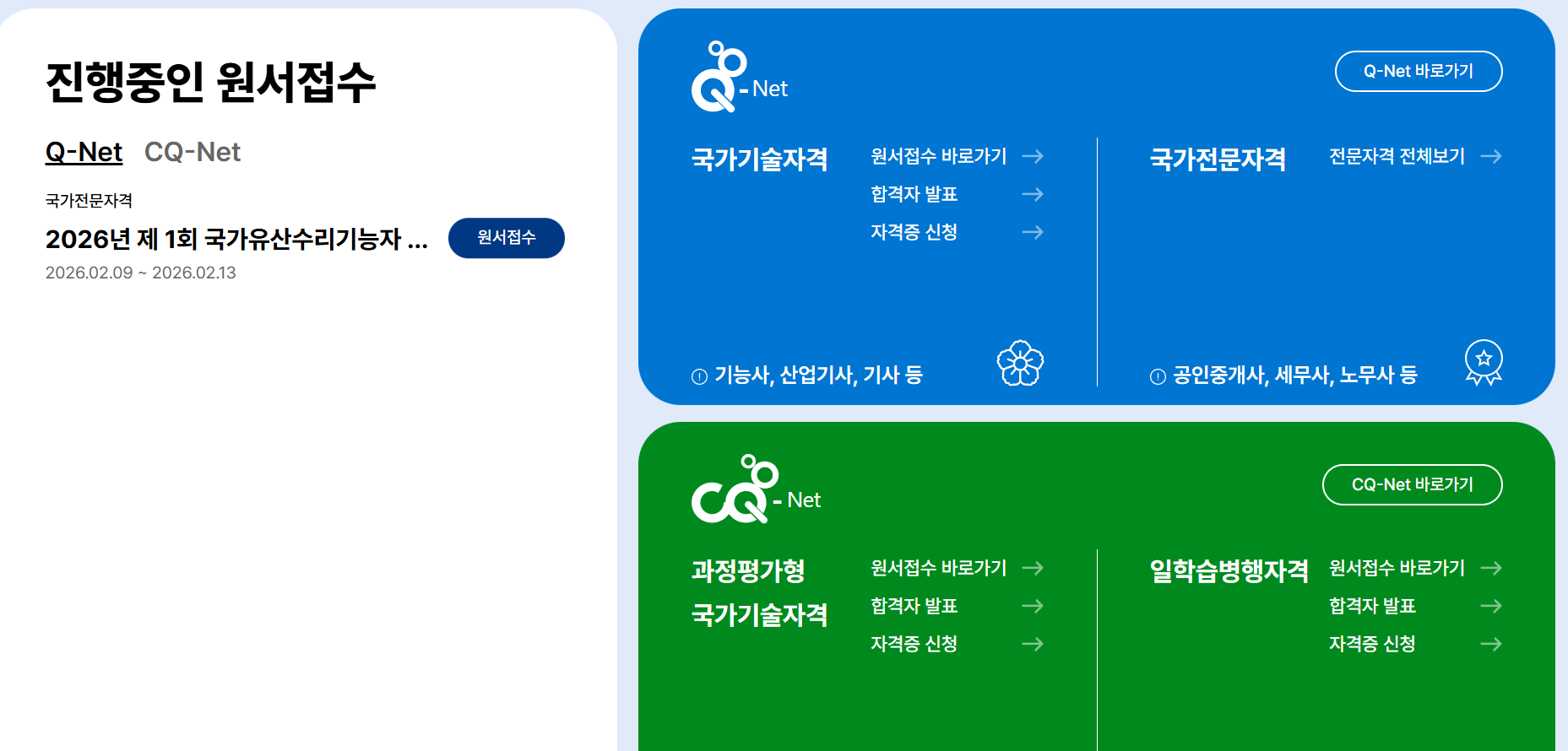 - 국가기술자격증: 정보처리기사, 전기기사, 한식조리기능사 등 우리가 흔히 아는 대부분의 '기사/산업기사/기능사' 시험이 해당됩니다.